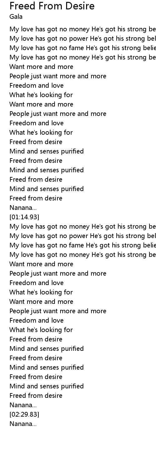 Gala - Freed From Desire lyrics Verse My love has got no money hes got his strong beliefs My love has got no power hes got his strong beliefs My love has got no fame hes got his strong beliefs My love has got no money hes got his strong beliefs Want more and more people just want more and more Freedom and love what hes looking for Want more and more people just want more and more.